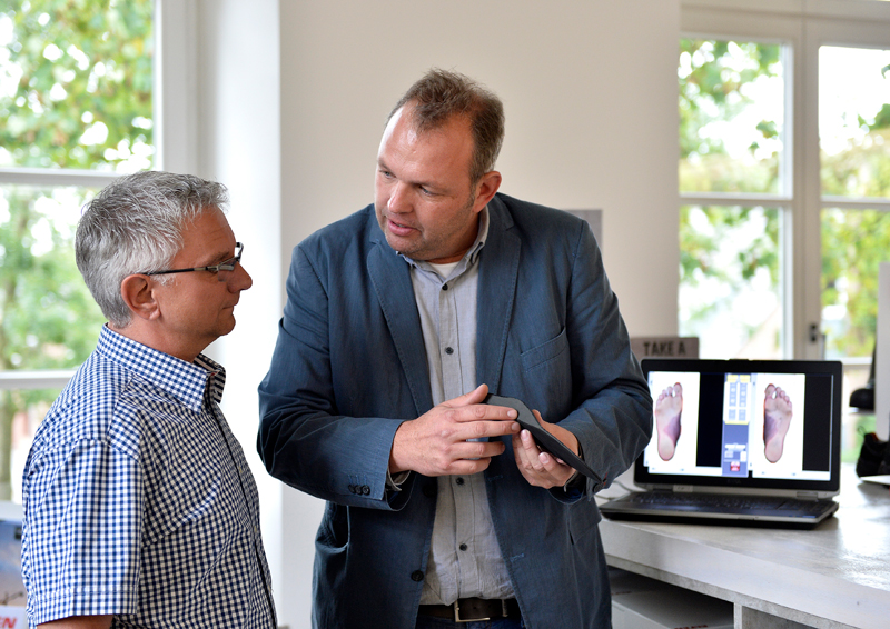 Als Sohn eines Schuhmeisters wurde Stefan Tintrup das Thema geradezu in die Wiege gelegt. Und aus eben dieser Tradition heraus entstand die Begeisterung für individuelle Beratung: »Mit unseren Vermessungslösungen und unterschiedlichen Passformen können wir gezielt auf die Bedürfnisse eingehen und Sicherheitsschuhe empfehlen, die eben nicht nur hohen Schutzanforderungen, sondern auch Komfort- und Fußgesundheitsansprüchen gerecht werden.« In Zusammenarbeit mit der Meisterin Nadine Claaßen bietet Stefan Tintrup Vor-Ort-Termine für Großkunden. Auf diese Weise können ganze Unternehmen die Vermessung ihrer Mitarbeiter zeitsparend durchführen lassen. »Kunden fragen die Fußvermessung an, weil es eine kluge Investition in die Mitarbeiter und deren Gesundheit ist. Im ersten Schritt arbeiten wir dann die gesamte Vorplanung aus«, so der Fußexperte. »Abhängig davon, ob wir vor Ort mit unseren elektronischen oder analogen Vermessungssystemen arbeiten können, müssen gerade einmal fünf Minuten für die Vermessung einer Person eingeplant werden.«