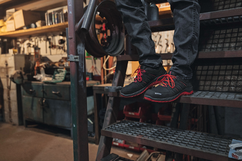 Unterschiedliche Arbeitsplätze bringen verschiedene Anforderungen an die Eigenschaften eines Sicherheitsschuhs mit sich. Deswegen bietet Elten inzwischen Modelle mit unterschiedlichen »Wellmaxx«-Sohlen an. Dazu zählt etwa die »Wellmaxx L10«-Laufsohle aus Polyurethan mit drei mm Profiltiefe. Mit einer Profiltiefe von 4 mm wie beim »Lakers XXT« beugen die »Wellmaxx Trainers«-Sohlen dem Stolpern, Rutschen und Stürzen vor, selbst auf glatten Industrieböden. Auch mit der SRC zertifizierten »Maxximo«-Laufsohle aus TPU sollen Träger stets sicher stehen – so auch mit dem »Maddox«: Das nach EN ISO 20345 zertifizierte Modell ist in den Größen 40 bis 48 als Schnürschuh oder Halbstiefel erhältlich. Die blaue oder rote Laufsohle verleiht dem Fußschutz zudem ein auffälliges Design. Erhältlich als S1P- und als S3-Variante, gibt es den »Maddox« inzwischen in einer zweiten Weite, um so den un-terschiedlichen Fußformen gerecht zu werden. Alle »Wellmaxx«-Laufsohlen sind bis 130 Grad Celsius hitze-, öl- und kraftstoffbeständig.