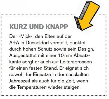 Das Obermaterial aus hydrophobiertem Veloursleder und Textil wehrt Nässe ab, das Textilinnenfutter ist aktiv. So eignet sich der »Mick« sowohl für Einsätze in der nasskalten Jahreszeit als auch für die Zeit, wenn die Temperaturen wieder steigen. Nach vier Jahren Pause wird Elten diese und weitere Neuheiten vom 24. bis 27. Oktober auf der Weltleitmesse in Düsseldorf präsentieren.