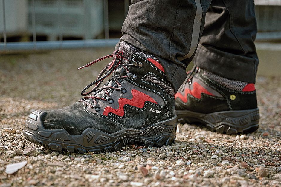 Der Sicherheitsstiefel bietet laut Hersteller aufgrund einer PU/PU-Laufsohle auf rutschigen oder unebenen Untergründen einen sicheren Halt. Zudem ist er mit einer 10 mm Absatzkante ausgestattet. Diese sorgt für einen festen Stand etwa auf Sprossen. Damit eignet sich »Mick« auch für Arbeiten, die – wie das Bohren an der Decke – häufig auf einer Leiter stehend durchgeführt werden. Mit einer PU-Überkappe und einer geschwungenen Seitenapplikation in Schwarz und Rot fällt der Sicherheitsstiefel überdies optisch auf.