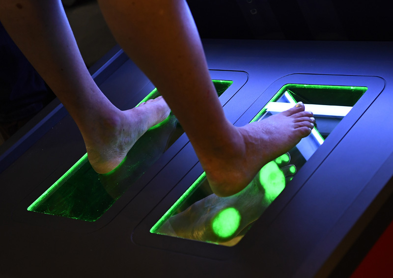 Weniger als zehn Sekunden dauert es, bis der Scanner die Volumina beider Füße inklusive der Achsstellung der Unterschenkel ermittelt und Hauptbelastungspunkte anzeigt. Das dabei erstellte 3D-Bild stellt zudem dar, ob die jeweilige Person mit Beschwerden wie Überpronation oder Supination zu kämpfen hat – also dem zu starken Knicken des Fußes beim Laufen nach innen oder außen.