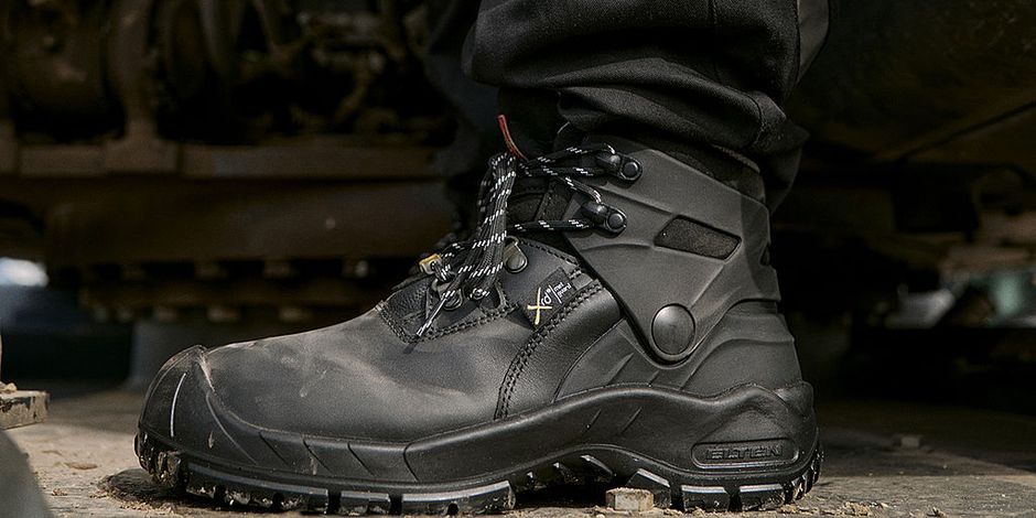 Das biomechanische Konzept der Kunststoffmanschette »Biomex Protection« führt den Fuß laut Elten bei drohenden Umknickunfällen in die richtige Fließbewegung, gibt dem Schaft dauerhaft Stabilität und legt sich schützend vor den Außenbandapparat. Denn beim Gehen bewegen sich die Kniegelenke und die Unterschenkel nicht geradeaus, sondern zur Körpermitte hin nach innen. Wird das Knie gebeugt, arbeitet der Unterschenkel normalerweise gegen den Schuhschaft. Dadurch entsteht ein Stabilitätsverlust, Umknickunfälle sind eine mögliche Folge, die »Biomex Protection« zu verhindern hilft. Das neue Elten-Modell »Elio Biomex M ESD S3« ist mit dieser schützenden Kunststoffmanschette ausgestattet.