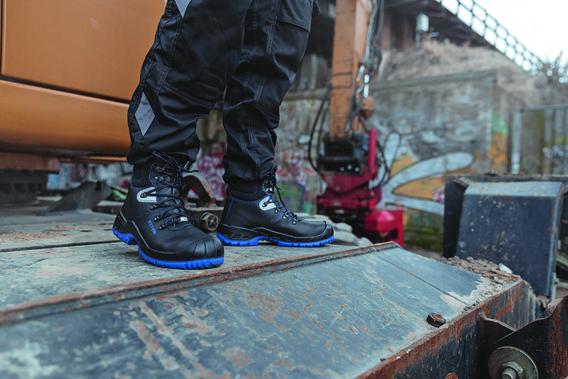 Der Sicherheitsschuhhersteller Elten kombiniert diese Eigenschaften in seinem Sicherheitsstiefel »Alessio blue Mid ESD S3«. Die grobstollige »Safety Grip«-Laufsohle sorgt laut Hersteller für besonderen Halt auf unsicheren Untergründen. Ein zusätzlicher Vorteil bei Arbeiten auf verdreckten oder matschigen Böden: Die besondere Anordnung der Profilrippen unterstützt schnelles Lösen von anhaftendem Schmutz aus dem Sohlenprofil. Sicherheitsschuhe wie der »Alessio« sind nicht zuletzt aufgrund ihres festen und strapazierfähigen Obermaterials aus Rindleder mit Spitzenschutz besonders für harte Einsätze auf dem Bau geeignet – auch bei schlechtem Wetter.
