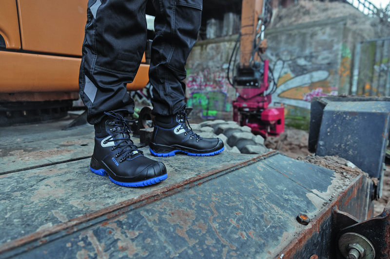 Immer mehr Frauen sind im Baubereich tätig. Sie benötigen Fußschutz, der sich der Anatomie des Damenfußes in besonderer Weise anpasst. Elten hat zur »Bauma« neue Modelle vorgestellt, die auf einem speziellen Damenleisten basieren. Neu im Portfolio für Frauen ist der Sicherheitsstiefel »Lena Black-Blue Mid ESD S3« mit einer metallfreien Durchtritthemmung und eingearbeiteter Stahlkappe. Für sicheren Halt auch auf rutschigen Böden sorgt die PU/PU-Laufsohle, die dank abgeschrägter Profilrippen über eine gute Rutschhemmung verfügt. Eine grobstollige S-Linien-Profilanordnung der Sohle unterstützt den natürlichen Abrollvorgang des Fußes. Bei knienden Tätigkeiten hilft eine bewegliche Sohle, die ein leichtes und angenehmes Abknicken des Fußes erlaubt. Als S3-Halbschuh für Damen zeigt Elten zudem den »Lena Black-Blue Low ESD S3«.