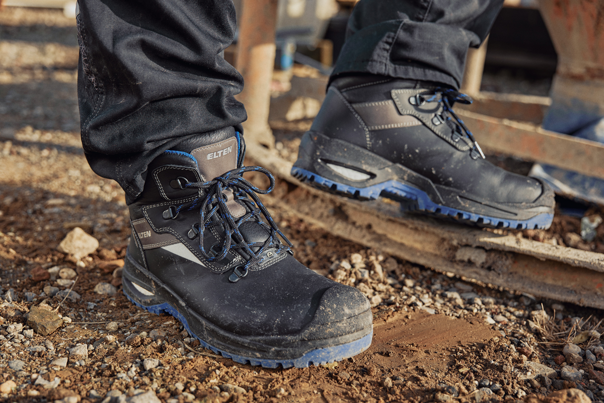 Bei der Entwicklung von Sicherheitsschuhen setzen Hersteller daher auf moderne Technologien, um diesen Problemen vorzubeugen. So setzt etwa Elten auf eine Laufsohlenkonstruktion, die als Sohlenkern über das Material »Infinergy« verfügt. Das ist ein von BASF entwickelter, elastischer Partikelschaum, der die Vorteile von TPU um die typischen Eigenschaften von Schaumstoffen ergänzt. Das Ergebnis: elastisch wie Gummi, aber federnd leicht. Das Material dämpft nicht nur den Aufprall des Fußes beim Laufen, sondern federt ihn auch wieder zurück. Durch das enorme Rückstellungsvermögen erhält der Träger einen Großteil seiner eingesetzten Energie beim Laufen wieder zurück. Gerade Beschäftigte auf Baustellen, die bei ihrer Arbeit sehr viel laufen und auf harten Untergründen unterwegs sind, können damit Ermüdungserscheinungen und Gelenkproblemen deutlich besser vorbeugen. Mit diesem Dämpfungskonzept sind beispielsweise die »XXSG«-Modelle von Elten ausgestattet. Zu der Serie gehören etwa die Sicherheitsstiefel »Francesco X XSG black Mid ESD S3« und »Stefano XXSG black-blue Mid ESD S3«. Diese sind für die raue Arbeitsumgebung auf Baustellen ein idealer Begleiter. Sie verfügen jeweils über ein Obermaterial aus Rindsleder und einen Spitzenschutz aus PU im Zehenbereich; das Material ist strapazierfähig und sorgt dafür, dass der Schuh im vorderen Bereich nicht allzu schnell verschleißt.