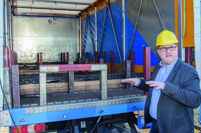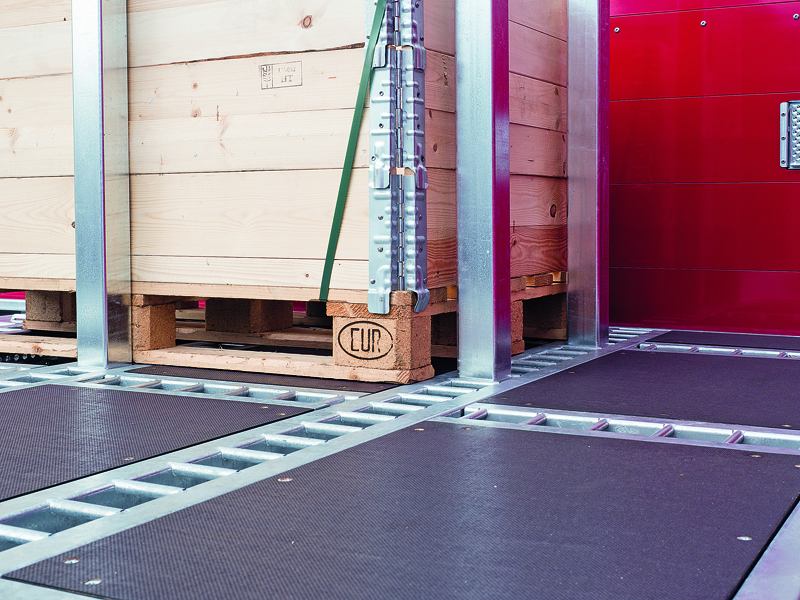 Einfach Rungen stecken, statt umständlich Gurten: »Mit der formschlüssigen Ladungssicherung auf der Fläche haben wir eine neue Gattung am Markt etabliert«, sagt Geschäftsführer Guido Elting. »Wir sichern dort, wo es das Ladegut erfordert – nicht da, wo es uns die Anschlagplätze für Zurrgurte gestatten.« Das quer und längs in der Ladefläche integrierbare Schienenraster mit Rungentaschen ermöglicht die individuelle Sicherung der Ladung in alle Richtungen. Selbst ungewöhnliche Formen lassen sich sichern. Im Vergleich zu Spanngurten, bei denen bestimmte Spannwege und -winkel eingehalten werden müssen, nehmen die Rungen weniger Platz weg.
