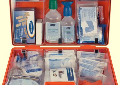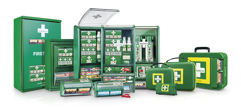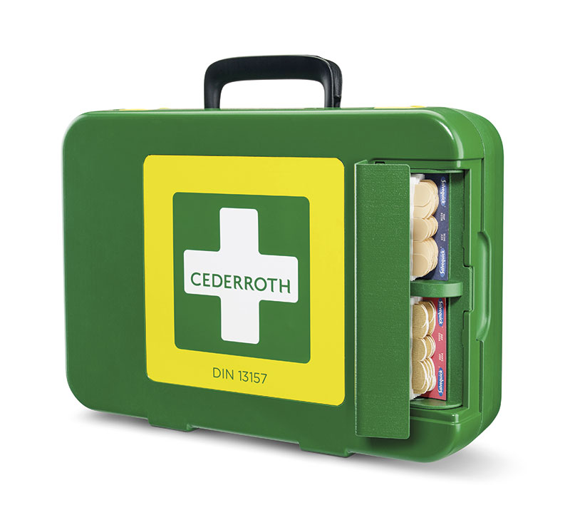 Mit dem »First Aid Kit DIN 13 157« stellt Cederroth einen strapazierfähigen Erste-Hilfe-Koffer aus Hartkunststoff mit Pflasterspender an der Außenseite vor. Der Koffer schützt vor Stößen, Staub und Feuchtigkeit. Extrem übersichtlich – Handschuhe, Schere und Beatmungsmaske sind beispielsweise im Deckel untergebracht. Rote Nachfüll-Etiketten mit Artikelnummer zeigen zudem an, wenn ein Produkt nachgefüllt werden muss. Deutliches Grün und Gelb als Signalfarben sorgen bereits von Weitem für gute Sichtbarkeit des Koffers. Im Koffer ist auch Platz für eine Augendusche oder andere Produkte eigener Wahl.