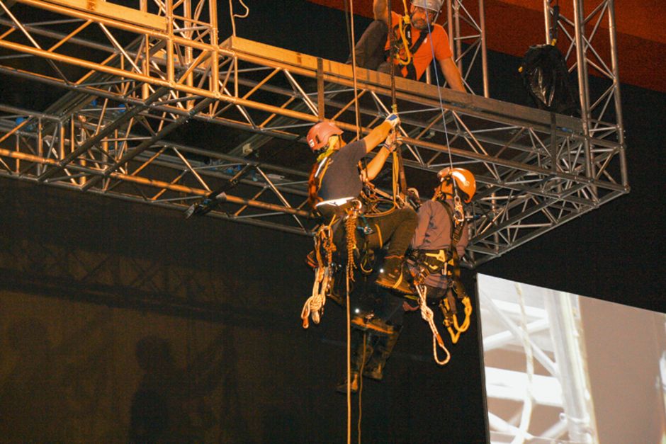 Den Ausgangspunkt zur Praxisdemonstration des zweiten Seminartages bot ein hängendes Gerüst, das von Mitarbeitern der Rope Access Solutions GmbH extra in der Halle angebracht wurde. In rund sechs Metern Höhe war es befestigt, zwischen den stählernen Armen eines Ladekrans, der die gesamte Bühne des Pier 2 überspannte. Von dort seilten sich Anwender ab und simulierten einen Unfall. Welcher Rettungsansatz ist jetzt der beste? PSA-Rettung mit Rettungshubgerät, gegenseitige Kameradenrettung unter Verwendung von Seilzugangstechnik oder doch ein ganz anderer? Die Antworten lieferte wieder Knut Foppe von Ropemission, der die Übung kommentierte. Zusammen mit Dr. Rüdiger Franz, ärztlicher Leiter des ganzheitlichen medizinischen Versorgungskonzeptes WINDEAcare, wurden verschiedene Rettungsverfahren beleuchtet, Stärken und Schwächen aufgezeigt, notfallmedizinische Hintergründe geliefert und konkrete Handlungsempfehlungen gegeben.