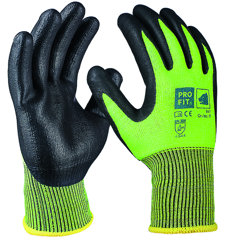 Beim »867 Schnittstopp Hivis« wurde der Strickbund etwas verlängert, um auch im Bereich des Handgelenks einen Schnittschutz gewähren zu können. Gerade die Pulsschlagader am Handgelenk sollte gut geschützt sein. Das Modell besitzt eine geschäumte Nitrilbeschichtung, hierdurch ist der Handschuh atmungsaktiv, lässt Flüssigkeiten aber bedingt durch. Im Gegensatz zu normalen Nitrilschaumbeschichtungen wurde diese Beschichtung nicht so offenporig produziert. Dies bietet den Vorteil, dass Flüssigkeiten wie Öle oder Fette geringer durch die Beschichtung gelangen. Die Beschichtung gewährt Grip in öligen sowie fettigen Bereichen – somit ist das Modell für den Umgang mit öligen und scharfkantigen Blechen geeignet.