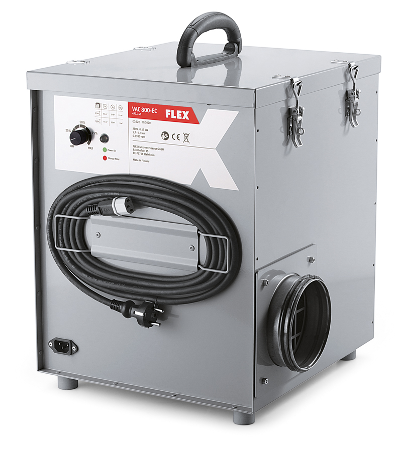 Zentrales Ausstattungsmerkmal des »Flex VAC 800-EC« ist ein leistungsstarker EC-Motor, der nicht nur für lange Lebensdauer, sondern auch für ein geringes Arbeitsgeräusch sorgen soll. Der stufenlos einstellbare Volumenstrom bewältigt Angaben des Herstellers zufolge bis zu 1 000 m3 pro Stunde in der Staubklasse M & H.