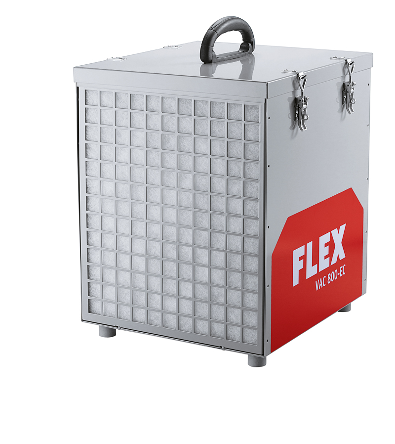 Feinste Stäube halten sich für mehrere Stunden in der Luft, sodass der alleinige Einsatz von Sicherheitssaugern nicht immer ausreicht. Im Rahmen der technischen Schutzmaßnahmen empfiehlt es sich daher, zusätzlich zu Sicherheitssaugern einen Bauluftreiniger zu verwenden. So hat FLEX als erster EW-Hersteller etwa mit dem VAC 800-EC ein transportables Gerät dieser Art in den Handel gebracht. Hier fließt die Luft während der Umwälzung durch mindestens drei Filter: einen Vorfilter G3 für Grobschmutz, einen Grobfilter G4 und zusätzlich einen Filter der H-Klasse. Je nach Staubart entspricht dieser den Bestimmungen der M-Klasse (H13-Filter) oder der H-Klasse (H14-Filter). Da Bauluftreiniger in der Regel über mehrere Stunden laufen, ist eine permanent zuverlässige Filterfunktion wichtig. Um dies zu gewährleisten, signalisiert eine Warnleuchte auf der Rückseite des VAC 800-EC Störungen im Filter, falls dieser gewechselt werden sollte. Um Lärmbelästigungen im Nachtbetrieb auszuschließen, ist der VAC 800-EC mit einer energiesparenden Turbine mit Nachtfunktion ausgestattet.