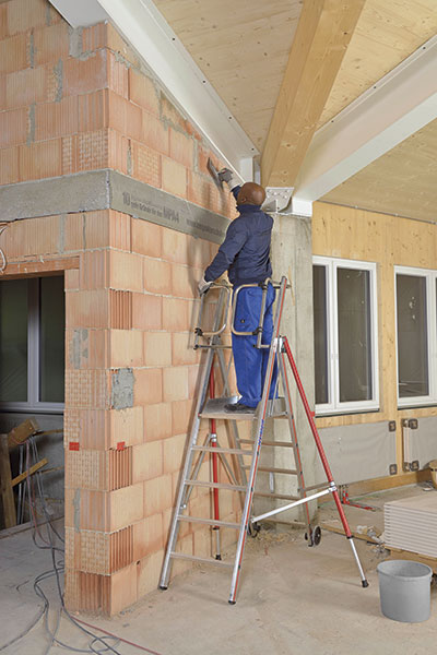 Förderwürdig sind auch ein- oder zweiseitig besteigbare Podestleitern, die ein sicheres Arbeiten auf einer ausreichend großen und mit einer mindestens 950 mm hohen Absturzsicherung umwehrten Plattform ermöglichen. »Unsere Podest- oder Plattformleitern sind bereits standardmäßig mit stabilisierenden Komponenten ausgestattet wie rutschsichere Stufen, Sicherungsgeländer, je nach Einsatzgebiet ab einer gewissen Höhe auch Ausleger und viele weitere sicherheitsverstärkende Funktionen. Das gewährleistet den Anwendern einen hoch sicheren Stand und eine bequeme Arbeitshaltung – die Bedingungen der BG Bau werden somit optimal erfüllt«, betont Michaela Weber, verantwortlich für das Marketing beim Steigtechnikproduzenten Hymer-Leichtmetallbau. Förderfähige Modelle des süddeutschen Aluminiumexperten sind die einseitig begehbare und fahrbare Podesttreppe »6888«, die beidseitig begehbare und fahrbare Podesttreppe »6889« sowie die Arbeitsplattform »8085«. Ebenfalls mit auf der Liste ist die erweiterbare Plattformleiter »Hymer ProTect«.