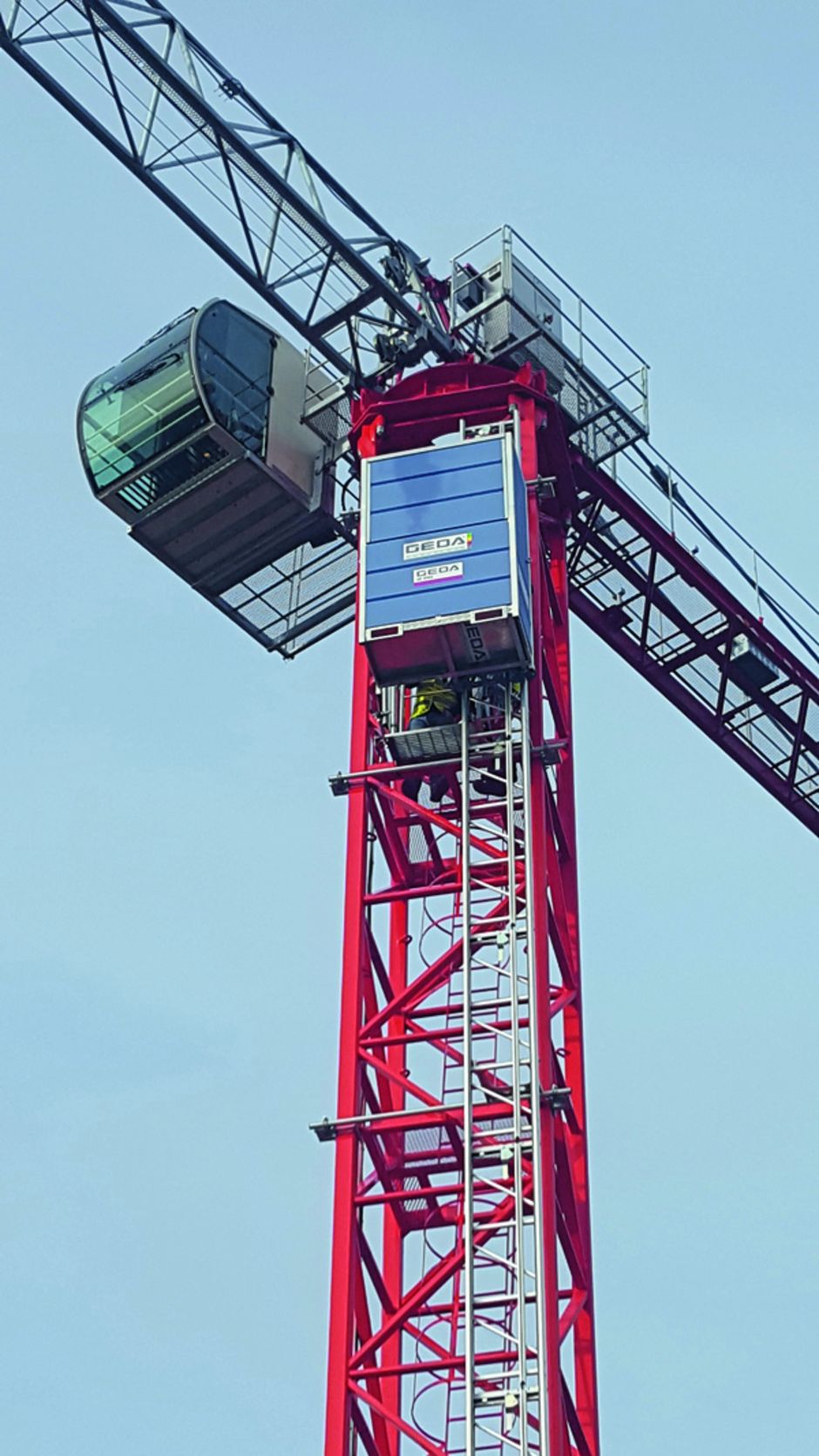 Der GEDA »2 PK« befördert den Kranführer in kürzester Zeit sicher an dessen Arbeitsplatz in luftiger Höhe. Riskante, anstrengende Kletteraktionen sind somit hinfällig und egal welche Witterungsverhältnisse vorherrschen, die Krankabine wird sicher und schnell erreicht.