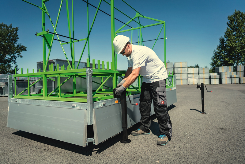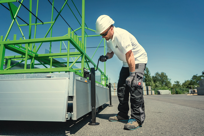 Es können sämtliche Arten von Bodenbelägen mit dem Gabelstapler geladen werden (Alu/Holz/ Stahl/ 30 cm oder 60 cm Breite); das bringt laut Hersteller einen enormen Zeitgewinn. Dazu kommt nach Ansicht des Unternehmens, dass der Anhänger inkl. Beladung mit dem Kran gehoben werden kann. Damit seien auch Rückseiten von Gebäuden, Hinterhöfe oder Dächer besser zu erreichen. Der Anhänger ist überdies nur 1,80 m breit und somit auch von weniger erfahrenen Mitarbeitern gut zu transportieren und zu rangieren. Die maximale Zuladung beträgt 2620 kg. Somit können bis zu 340 m² Gerüstmaterial transportiert werden, ohne dass überladen wird. Darüber hinaus, so gerüstmieten4you, sei zu erwähnen, dass der Anhänger durch seinen tiefen Schwerpunkt und seine optimale Ladungssicherung auch bestmögliche Sicherheit im Straßenverkehr gewährleisten könne und das Alu-Gerüst ein leichteres Handling ermögliche, was zur Schonung der Arbeitskraft beitrage. Hinzu komme eine größere Flexibilität durch den mobilen Anhänger sowie eine erhebliche Ersparnis bei den Rüstzeiten. Fertigungspartner des Systems ist die Kran- und Industrieservice GmbH in Wismar. J