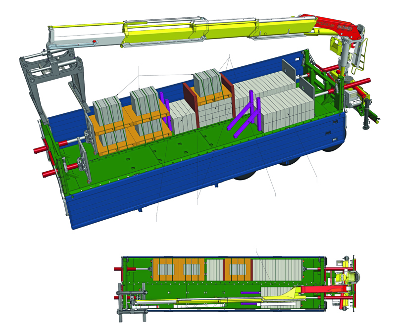 Mit dem System können lose Kalksandsteine, Steine in Palette/Folie sowie Sonderformate in Kombination mit den Einsteckrungen gesichert werden. Durch die großen Hübe der Presswände und den vielfältigen Steckmöglichkeiten der Einsteckrungen können auch Teilladungen schnell gesichert werden.