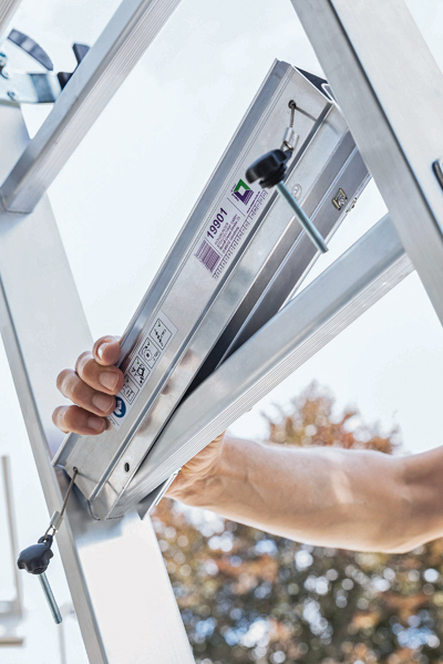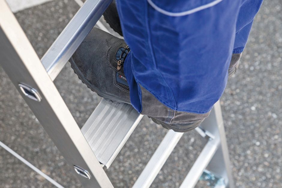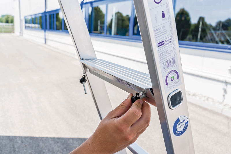 Für Sicherheit bei der Arbeit sorgen auch die zweiteilige Stufen-Schiebeleiter und die Stufen-Glasreinigerleiter, welche in Anlehnung an die Neufassung der TRBS 2121 Teil 2 entwickelt wurden und damit bereits den verschärften Technischen Regeln für die Betriebssicherheit entsprechen. Werden Leitern demnach als Arbeitsplatz verwendet, dürfen neben Standplattformen nur noch Stufen anstatt Sprossen als Standflächen benutzt werden.