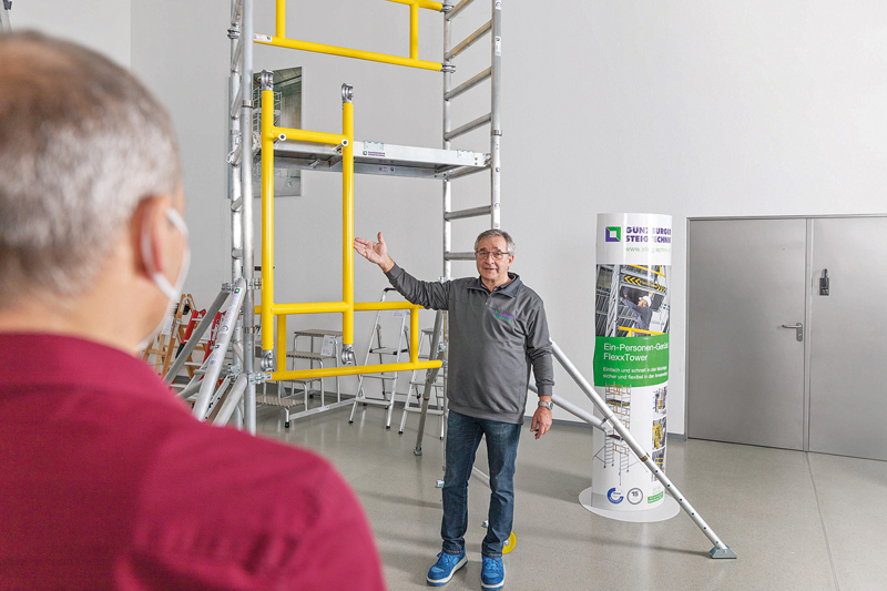 Bei den Roadshows können Anwender und Fachhändler die innovativen Lösungen des Unternehmens auch selbst testen. Zum ersten Mal ist dabei das Erleben maßgefertigter Sonderkonstruktionen mithilfe einer VR-Brille möglich. Die Events finden kontinuierlich statt – natürlich unter Einhaltung aller geltenden Hygiene- sowie Sicherheitsregeln. »Wir bekommen zu unseren Roadshows sehr viele positive Rückmeldungen. Aus diesem Grund bauen wir unser erfolgreiches Konzept jetzt aus: Es gibt noch mehr Inhalte und noch mehr Termine, bei denen wir direkt bei den Interessenten Halt machen und unsere Innovationen live vor Ort präsentieren – sofern das die Entwicklung der Coronavirus-Pandemie zulässt. Ergänzt werden unsere Roadshows jetzt durch eine neue Website, auf der alle Informationen zu den Live-Shows zu finden sind – von den Tourdaten über die Inhalte bis hin zur konkreten Terminanfrage«, betont Ferdinand Munk, Geschäftsführer der Günzburger Steigtechnik GmbH.