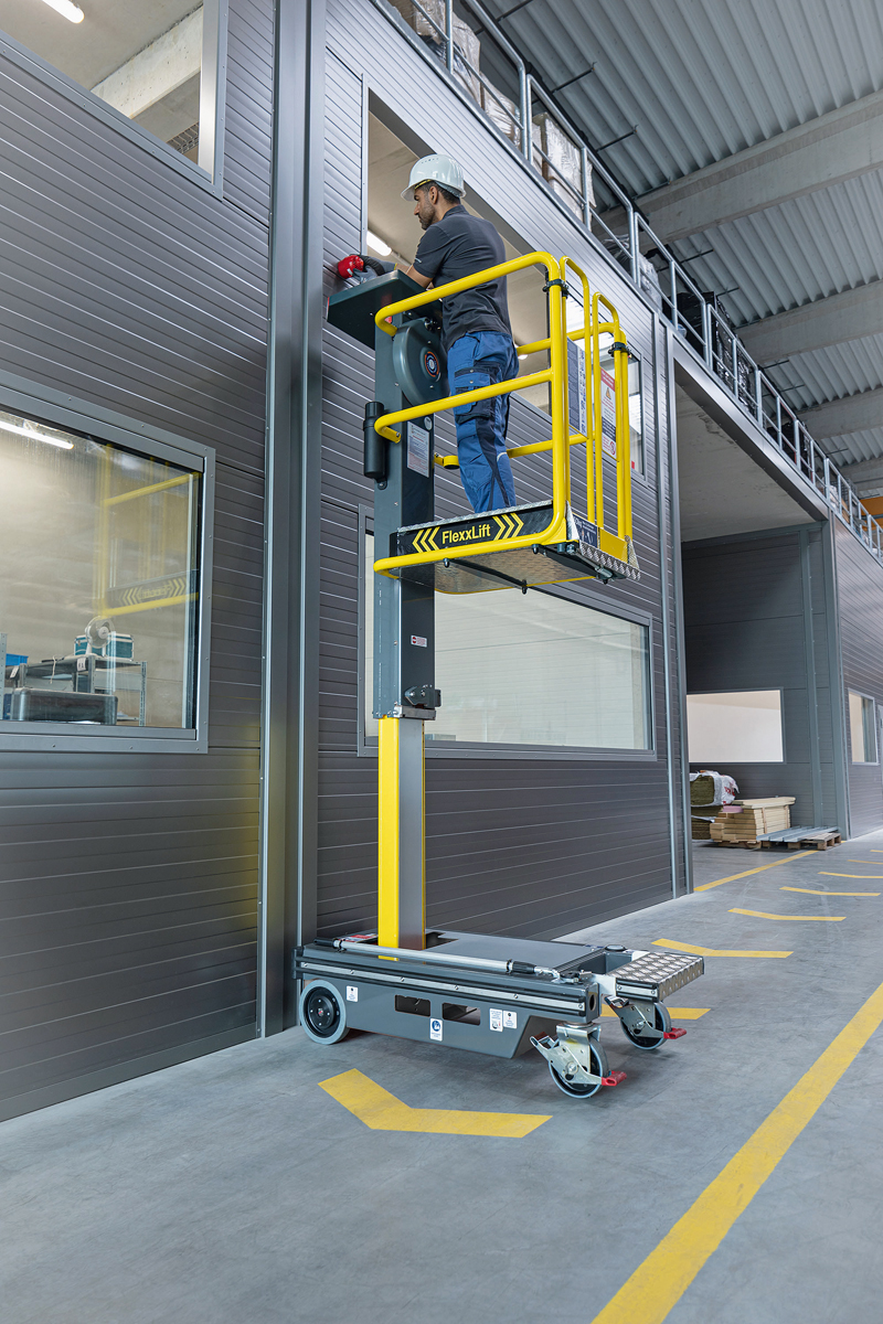 Der Anwender erreicht mit der Neuheit Arbeitshöhen bis zu 4,2 m und befindet sich dabei stets im rundum gesicherten Plattformbereich. Aufgrund seines Plus an Sicherheit wurde der »FlexxLift« außerdem bereits in das Arbeitsschutz-Prämienprogramm der BG Bau aufgenommen. »Gerade Installations-, Wartungs- und Reparaturarbeiten können auch mal länger dauern. Um sich dabei auf einen sicheren Arbeitsplatz verlassen zu können, sollten Anwender auf Vertikalmastlifte wie den neuen FlexxLift vertrauen«, sagt Ferdinand Munk, Geschäftsführer der Günzburger Steigtechnik GmbH. »Hier befindet man sich immer im rundum gesicherten Arbeitsbereich und hat auch noch Platz für Werkzeug und andere Materialien. Und auch in Bezug auf das Handling bietet unsere Neuheit echte Mehrwerte.«