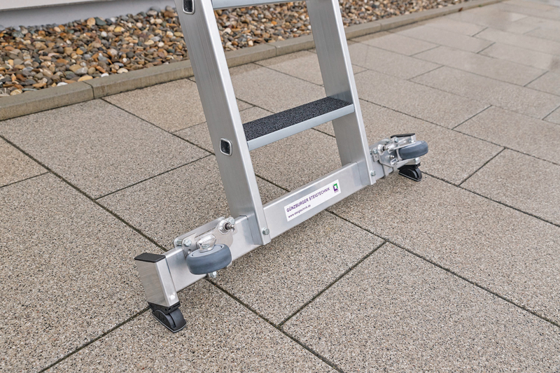 Neben der Arbeitssicherheit hat die Günzburger Steigtechnik außerdem die Ergonomie im Blick und bietet nach eigenen Angaben deshalb für die Traversen ihrer beiden Produktneuheiten den neuen Nachrüstsatz »roll-bar« an. Dieser lässt sich einfach, schnell und vor allem ohne Bohrungen auch nachträglich montieren und bringt nach der Devise »Rollen statt Schleppen« einen entscheidenden Ergonomievorteil beim Transport der zweiteiligen Stufen-Schiebeleiter und Stufen-Glasreinigerleiter mit. Besonders ergonomisch: Die Transportrollen werden einfach mit dem Fuß in Position gebracht.