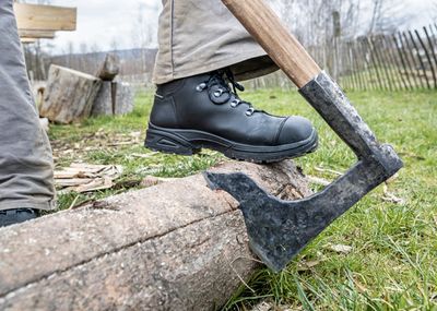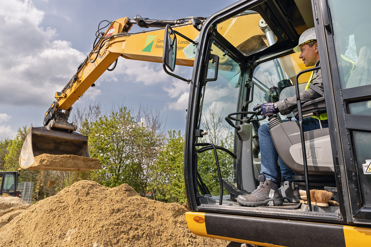 Bereits bei der ersten Anprobe stellte bauSICHERHEIT-Bereichsredakteur Colin Fritz fest, dass sich der Sicherheitsschuh trotz robustem Aufbau, einem Durchtrittschutz sowie einer Zehenschutzkappe angenehm anfühlte: »Überrascht hat mich, dass sich der S3-Schuh so bequem anfühlt. Er wirkt hochwertig verarbeitet, sorgt für einen festen Stand und gibt dem Fuß viel Halt. Im ersten Moment würde man deshalb nicht davon ausgehen, dass ein solcher Schuh trotzdem eine so hohe Flexibilität aufweist.« Ausprobieren konnten die Teilnehmer den Schuh unter realen Arbeitsbedingungen. Unter anderem durften die Pressevertreter in einen Bagger steigen, um das Verhalten des Schuhs beim Ein- und Aussteigen sowie bei typischen Bewegungen zu testen. »Sowohl beim Aufstieg auf den Bagger als auch in Situationen, in denen der Zehenbereich stark gedehnt wird, etwa beim Vorbeugen oder Herunterspringen, hat sich der Schuh gut angefühlt – er schränkt bei typischen Arbeitsbewegungen nicht ein«, urteilte Colin Fritz.