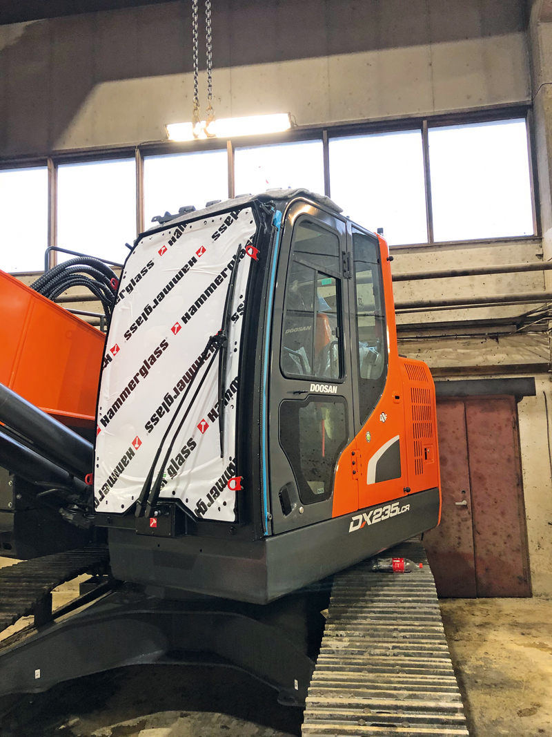 Vielseitig verwendbar: Das hartbeschichtete Polycarbonat lässt sich in jedes Baufahrzeug problemlos einsetzen – egal ob als Seiten- oder Frontscheibe.