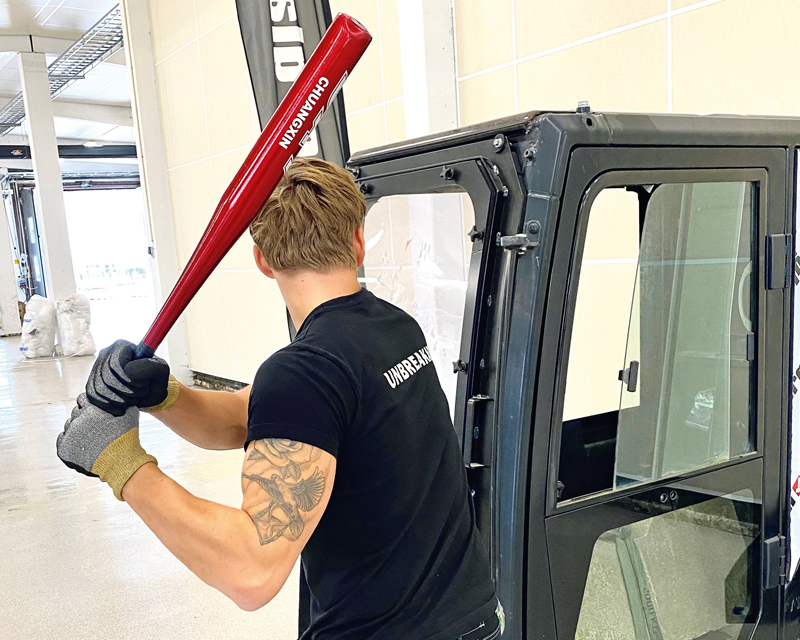 Florian Lauterbach: Aus Schweden sind wir besonders hohe Schutz- und Zertifikationsanforderungen gewohnt und können daher auch die Bedingungen in Deutschland vollumfänglich erfülllen. Das erforderliche Sicherheitsniveau hängt immer von der Art der Arbeit ab – erkennbar an unseren Schutzklassen 1 bis 3: In der ersten Schutzklasse sprechen wir von Hammerglass-Frontscheiben mit 6 bis 8 mm Dicke, um das Risiko von zerbrochenem Glas zu vermeiden. Bei Arbeiten in schwieriger Umgebung mit Steinschlag- oder Explosionsrisiko werden wiederum dickere Scheiben mit RABS-Zulassung benötigt, die umfangreiche Tests bestehen müssen. Dazu zählen Tests für Abriebschutz, UV-Schutz, Dehnungsgrad nach der ECE-Richtlinie R43, aber auch die Prüfung der Durchbruchhemmung nach DIN EN 356, P8B, wobei die Scheibe 72 Schläge einer maschinell geführten Axt standhalten muss, ohne zu zerbersten. Noch höhere Anforderungen entstehen bei der Druckwellenprüfung durch Detonationen sowie der Prüfung der Durchbruchhemmung, bei der ein 1 kg schweres Projektil mit rund 450 km/h gegen die Scheibe geschossen wird, was den Aufprall eines großen Steins mit besonders hoher Geschwindigkeit gleichkommt. In einem Stahlrahmen erfüllt Hammerglass diese RABS-Anforderungen. Oliver Afsah: Ein ebenso wichtiger Punkt ist für Baumaschinenfahrer natürlich der FOPS-Schutz. Was viele nicht wissen: Durch Hammerglass ist die Verwendung eines verstärkenden Gitters unnötig – die Scheibe allein ist widerstandsfähig genug, was einen gewaltigen Vorteil gegenüber anderen Lösungen bringt.bauSICHERHEIT: Nun ist der deutsche Markt traditionell hart umkämpft. Können Sie mir sagen, wie hoch die Anteile von OEM- und Nachrüstgeschäft bei Hammerglass derzeit sind?