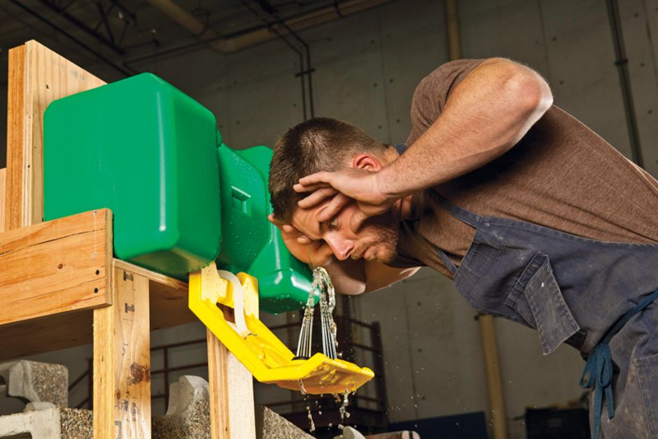 Spülflaschen empfehlen sich obendrein als gängiges, handliches Hilfsmittel für den mobilen Einsatz am Körper, Werkzeugkasten, Handschuhfach oder Erste-Hilfe-Kasten. Solche Augenduschen ohne Wasseranschluss gelten als Medizinprodukte nach Medizinproduktegesetz (MPG). Eine normgerechte Kennzeichnung mit »Augenspüleinrichtung« E011 nach ASR A1.3:2013 und EN ISO 7010 stellt die Auffindbarkeit im Notfall sicher. J