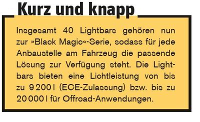 Die bereits Anfang 2022 auf dem europäischen Markt gelaunchte »Black Magic«-Serie könne vor allem durch ihr robustes Design, das Aluminiumgehäuse und die gute Lichtperformance punkten. Bei den Lightbars handelt es sich um Zusatzscheinwerfer mit starker Lichtleistung. Je nach Zulassung bieten sie bis zu 9 200 oder 20 000 l Höchstleistung und eignen sich damit für Situationen, in denen es auf die bestmögliche Ausleuchtung der Umgebung ankommt. Nun gehören neben den bereits erhältlichen Lightbars der ersten Generation für Offroad-Anwendungen auch 18 weitere Lightbars für Offroad sowie 14 Lightbars mit ECE-Zulassung R149 für die Verwendung als Zusatzscheinwerfer im Straßenverkehr zum Portfolio. Bei den »Black Magic«-Lightbars handelt es sich um Zusatzscheinwerfer mit starker Lichtleistung.