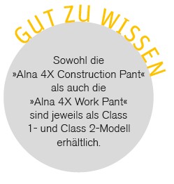 Die »Construction Pant« der »Alna 4X«-Kollektion besteht aus einem leichten bi-elastischen Stretchstoff und verfügt über einen Zwickel im Schritt, der für noch mehr Bewegungsfreiheit sorgen soll. Die Strapazierfähigkeit wird durch eine »Cordura«-Verstärkung erzielt, die nicht nur im Knie- und Beinbereich verarbeitet wurde, sondern auch in den seitlichen Hängetaschen. Platz für Werkzeuge bieten die beiden Oberschenkeltaschen mit Verschluss. Ein Zollstock findet in einer separaten Zollstocktasche seinen Platz. Eine breite Gürtelschlaufe am Rücken sorgt für einen optimalen Sitz, die reflektierenden Details für bessere Sichtbarkeit und Sicherheit bei schlechten Lichtverhältnissen. Praktische Kniepolstertaschen sind bequem von außen zugänglich. Zu guter Letzt finden Ausweis oder wichtige Dokumente in einer extra Tasche ihren Platz. Die »Alna 4X Construction Pant« ist sowohl als Class 1 als auch als Class 2 Modell erhältlich.