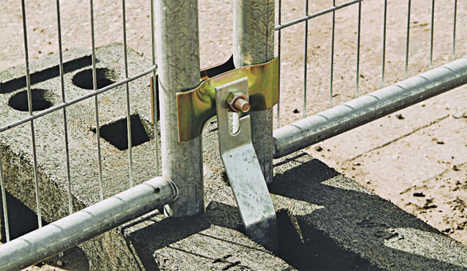 Die Basis seines stabilen Bauzaunfeldes stellen die Bauzaunfüße dar, so Heras. Zu beachten sind dabei sowohl deren Gewicht und Aufstellung als auch der Untergrund. Bei der Wahl der Bauzaunfüße, die mindestens 16 kg wiegen müssen, stehen Beton- und Recyclingfüße zur Auswahl: Erstere haben ein Gewicht von 24 - 35 kg und bieten dadurch eine höhere Standfestigkeit. Aufgrund der Anfälligkeit des Materials empfiehlt Heras aber, immer einen Betonfuß mit Stahlarmierung zu wählen, sodass bei einem möglichen Bruch dennoch eine gewisse Standfestigkeit erhalten bleibt. Recyclingfüße wiegen zwischen 16 kg und 22 kg und lassen sich daher einfacher transportieren. Allerdings wirkt sich das geringere Gewicht nachteilig auf die Standfestigkeit aus.
