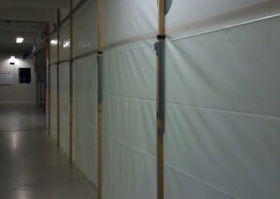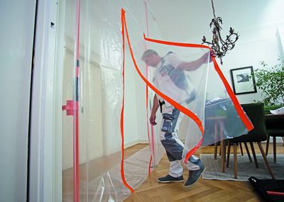 Lassen sich die Werkstücke nicht ohne Staubfreisetzung bearbeiten, sollte der Arbeitsbereich zunächst auf das notwendige Minimum reduziert werden. Flexible Staubwände aus Baufolie und Teleskopstangen sind schnell und einfach aufgestellt. Das Besondere an den flexiblen Staubschutzwänden wie beispielsweise der »Heywall« sind die Teleskopstangen. Die Kopfplatten verfügen über Klemmvorrichtungen, welche die Baufolie halten und später an der Raumdecke fixieren. Die herunterhängende Folie wird unter den Stützenfüßen ein zweites Mal fixiert. Werden die Stangen in einem Abstand von circa 1,50 m aufgestellt und ausgerichtet, ergibt sich eine haltbare und undurchlässige Abschottung. Normale Zimmer lassen sich hierbei von einer einzelnen Person ohne Leiter, Latten oder Nägel abtrennen.