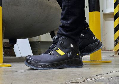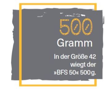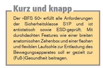 Der »BFS 50« erfüllt die Standards der Sicherheitsklasse S1P. Die mit Carbonfasern verstärkte Zehenschutzkappe ist nicht nur extra breit, sondern auch leicht und damit beim Tragen kaum wahrnehmbar. Ein besonderes Plus an Sicherheit bietet zudem der Durchtrittschutz aus Textil-Kevlar-Gewebe. Zusätzlich schützt die TPU-beschichtete Überkappe das Obermaterial zuverlässig vor Verschleiß.