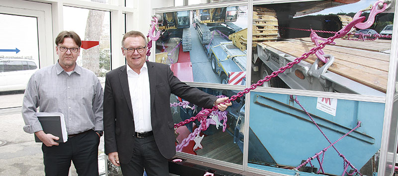 Um den Verlader und Fahrer mit dem nötigen Wissen zur umfassenden Gefahrenbeurteilung und korrekten Ladungssicherung auszustatten, bietet der Hersteller zahlreiche Broschüren und Schulungen im hauseigenen »Center for Chain Knowledge« oder auch vor Ort beim Kunden an. Dabei stellt Hermann Kolb klar, dass für Schäden bei fehlerhafter Ladungssicherung längst nicht nur der Fahrer haftet, sondern auch der Fahrzeughalter und der Verlader. »Im ungünstigsten Fall ist das natürlich ein- und dieselbe Person, aber es muss im Interesse aller sein, hier effiziente Lösungen anzubieten«, sagt Kolb. Und beim einen oder anderen Baumaschinen-Hersteller sei er auch schon vorstellig geworden mit konkreten Vorschlägen, wie sich der Transport der großen und teuren Maschinen sicher und ohne Gefahr für Menschen bewerkstelligen lässt. »Große Messen wie die ›Bauma‹ sind dafür ein guter Platz«, sagt Messe-Profi Kolb_ Man müsse nur bei der Anlieferung und beim Auf- und Abladen mal einen Blick werfen, und schon erkenne man, wo die Schwachstellen liegen. Anregungen für mögliche Verbesserungsvorschläge an die Hersteller bekommt er auch aus dem – wie die bauSICHERHEIT im SBM Verlag erscheinenden – bauMAGAZIN, das während des Gesprächs druckfrisch vor ihm liegt, versehen mit zahlreichen Klebemarkierungen – »alles Hersteller, die mein Team und ich noch ansprechen möchten«, erläutert Kolb.