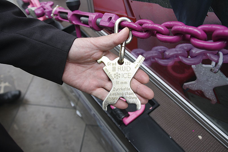 Bei Anschlagmitteln und Ladungssicherung will RUD »das richtige Produkt für die richtige Anwendung« bieten, sagt Hermann Kolb, Bereichsleiter für Anschlag- und Zurrketten sowie Lastaufnahmemittel. Um die richtige Anwendung sicherzustellen, gibt es die Produkte nicht im Direktvertrieb, sondern ausschließlich über Vertriebspartner aus dem Fachhandel, die den Endkunden kompetent beraten. Dabei geht es nicht nur um externe Normen, die eingehalten werden müssen, sondern auch um eigene Kriterien, nach denen RUD die Ketten fertigt. Markantestes Beispiel hierfür ist die Farbe Pink, die sich RUD als eingetragenes Warenmuster schützen ließ.