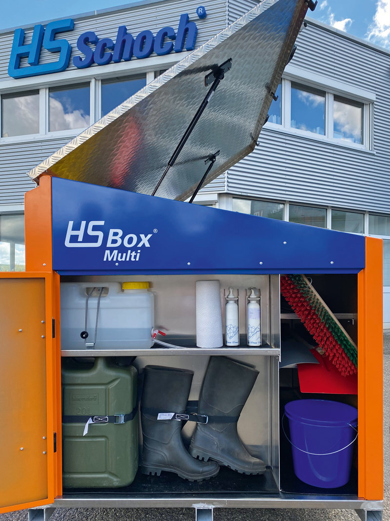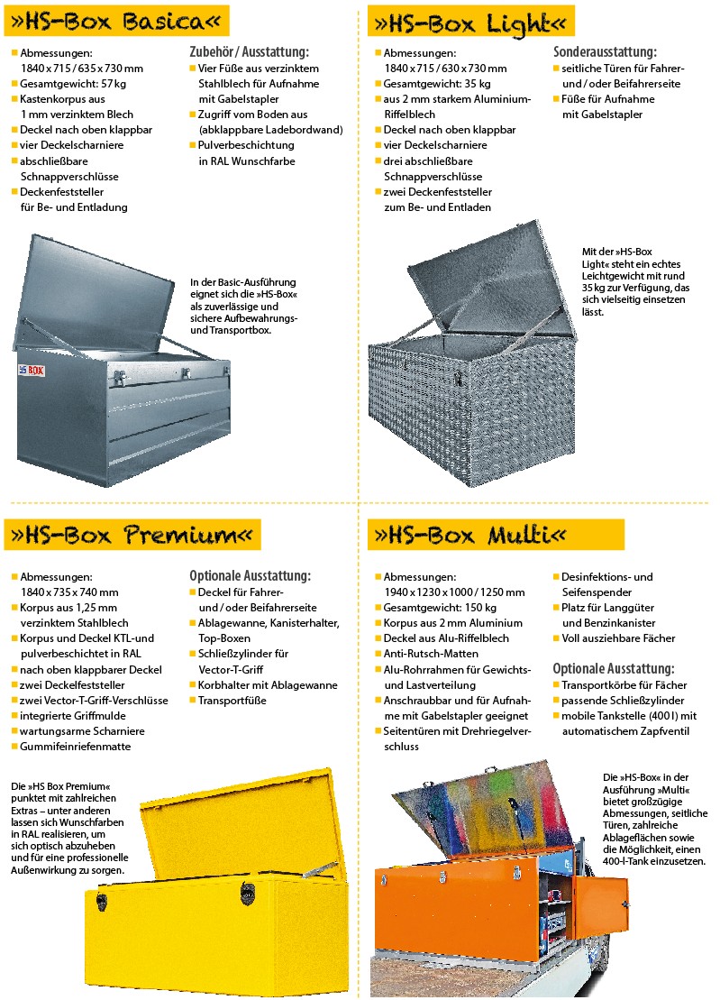 Grundsätzlich lassen sich alle Box-Ausführungen von HS-Schoch individuell gestalten – auch Spezialstaukästen oder seitliche Türen für eine vereinfachte Entnahme sind möglich. Gleiches gilt laut HS-Schoch für entsprechende Füße zur Gabelstapler- oder Radlader-Beladung. »Entstanden ist die Idee aus der Erfahrung heraus: Wir arbeiten eng mit Anwendern zusammen und tauschen uns regelmäßig aus. Auf diese Weise können wir die Innenausstattung der Boxen praxistauglich konstruieren und uns auf veränderte Anforderungen einstellen«, stellt Dietmar Beuther klar.
