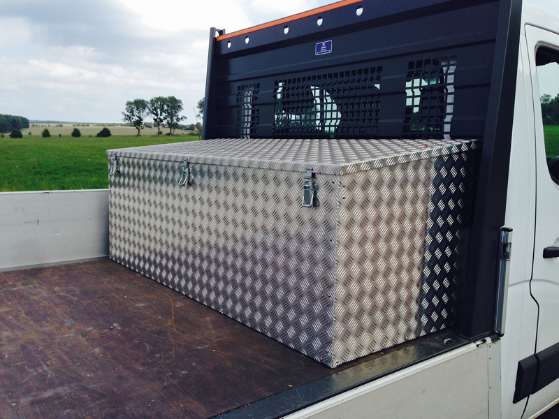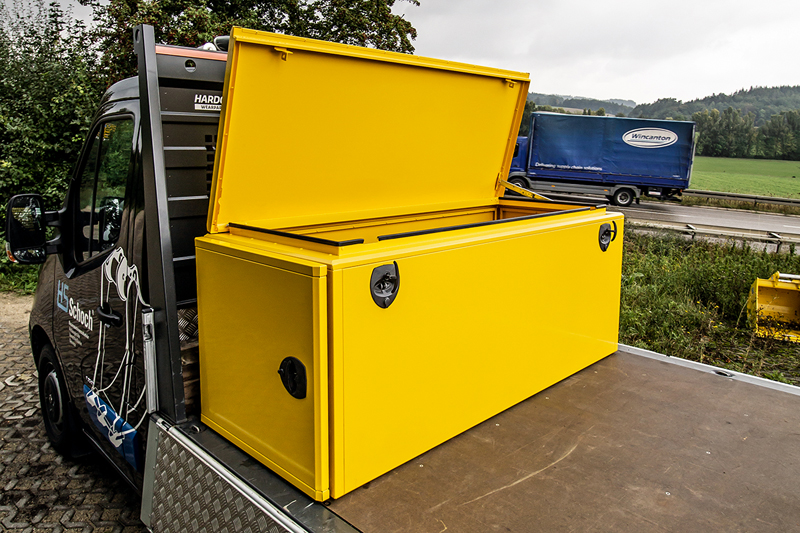 Insgesamt hat HS-Schoch mit »Premium«, »Basic« und »Light« drei neue Varianten entwickelt, die speziell für den Einsatz auf der Transporterpritsche konzipiert wurden. Als tatsächliches Leichtgewicht erweist sich hierbei die »Light«-Box: Sie dient als gewichtsoptimierte Variante und wird aus 2 mm starkem Aluminium-Riffelblech gefertigt, was ein Gesamtgewicht von gerade einmal 35 kg zulässt. »Gedacht ist sie zur Lagerung sowie dem Transport von Werkzeug, Arbeitsmaterial oder Kanistern«, so Dietmar Beuther. Wie bei allen drei Ausführungen ist der Deckel nach oben hin klappbar und ebenfalls aus Alu-Riffelblech hergestellt. Abschließbare Schnappverschlüsse sorgen dafür, dass die Box diebstahlsicher ist. Ähnlich verhält es sich laut Dietmar Beuther mit der »Basic«-Ausführung: Ein Kastenkorpus aus verzinktem Blech, ein Gewicht von 57 kg, zwei Deckelfeststeller zum vereinfachten Be- und Entladen sowie ebenfalls abschließbare Verschlüsse sollen die »Basic«-Box, wie die Bezeichnung bereits verrät, zu einer soliden Grundausstattung auf der Transporterpritsche machen.