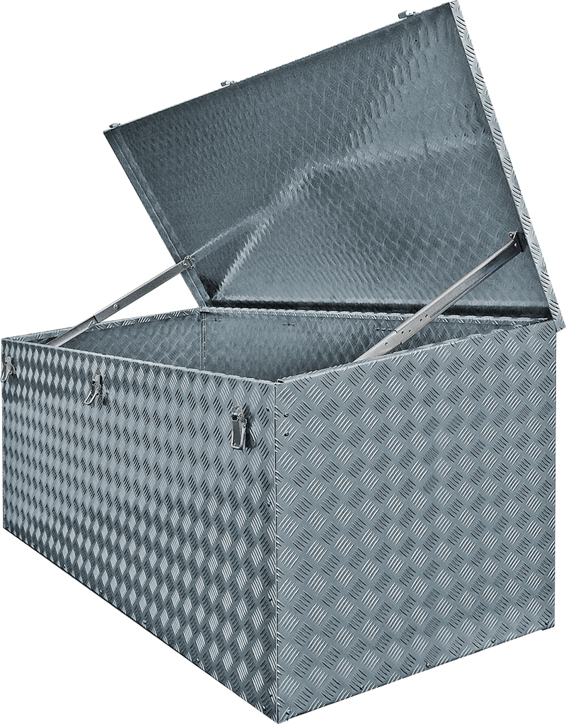 Zusätzlich zu den »Basic«-, »Light«- und »Premium«-Ausführungen hat HS-Schoch die sogenannte »Multi-Box« im Programm. Sie ist mit 1 940 x 1 230 x 1 250 mm großzügig dimensioniert und aus 2 mm starkem Aluminium gefertigt – der Deckel hingegen besteht aus Alu-Riffelblech. Trotz der Maße kommt das »Multitalent« auf ein geringes Eigengewicht von 150 kg. Mithilfe der unterhalb angebrachten Alu-Rohrrahmen soll für eine ideale Gewichts- und Lastverteilung gesorgt werden. Damit, so Dietmar Beuther, lasse sich die »Multi-Box« einfach anschrauben und sicher mit dem Stapler transportieren. Bei Betrachtung des Innenraums wird deutlich, wie vielseitig die Box verwendbar ist.