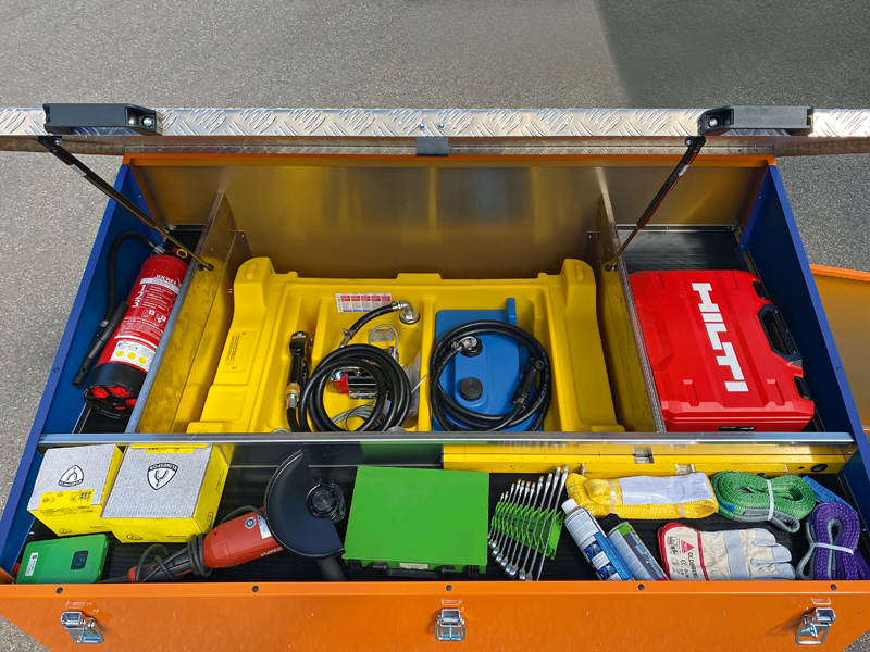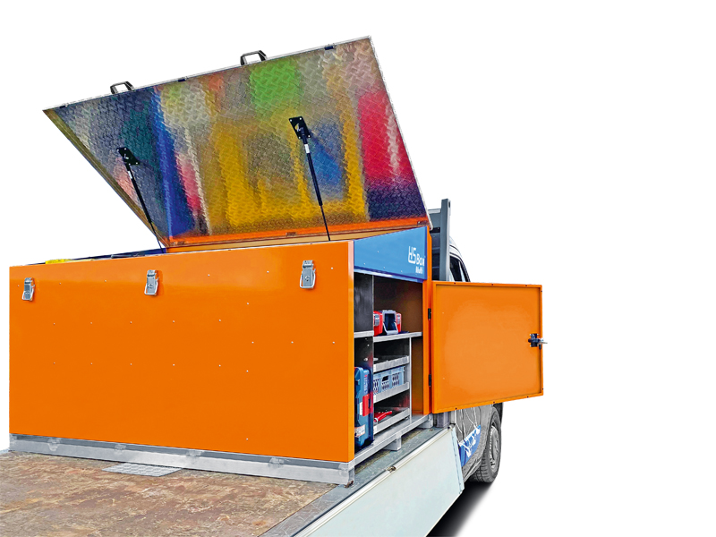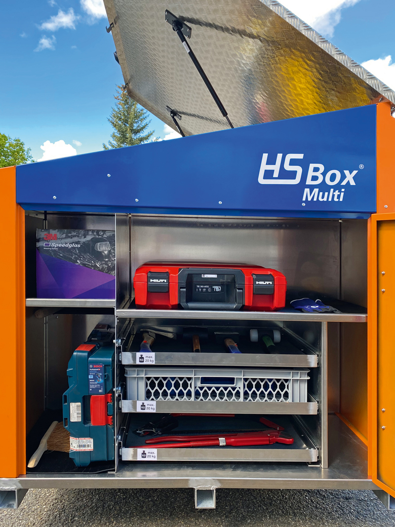 Als Experte für Ladegutsicherungssysteme rät Dietmar Beuther deshalb zu geschlossenen Aufbewahrungsmöglichkeiten, die speziell für den Transport auf der Pritsche konzipiert sind: »Zum einen wird das Herumfliegen von Teilen und damit eine ernstzunehmende Gefahr vermieden, zum anderen sorgen Transportboxen für einen aufgeräumten Eindruck: Denn das Fahrzeug dient immer auch als Aushängeschild der eigenen Firma und sollte vor dem Kunden einen guten Eindruck machen.« Gleichwohl verweist Beuther auf die Tatsache, dass eine Box-Aufbewahrung zahlreiche Arbeitsschritte erleichtert. So müsse man etwa einzelne Gegenstände nicht erst zeitraubend suchen, sondern könne sie mithilfe von Aufbewahrungsfächern übersichtlich einsortieren und griffbereit aufbewahren. Als Beispiel nennt Marcel Schoch hier die erst kürzlich vorgestellten »HS-Boxen« (die bauSICHERHEIT berichtete darüber in der Ausgabe 04 / 21 ab Seite 58). Sie dienen als Lager sowie Transport- und Werkzeugkiste. Zugleich, so Marcel Schoch weiter, schütze die Box das Werkzeug aber auch vor Witterungseinflüssen und Diebstahl.