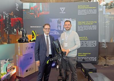 Mit dem »BionicBack« stellt das Start-up ein Exoskelett für den Rücken vor. »Wir bezeichnen es als einen zweiten künstlichen Rücken, den man trägt und der einem die Belastung vom Rücken abnimmt«, erklärt Firmengründer Dominik Heinzelmann. Innerhalb des Systems sind elastische Elemente verbaut, die beim Beugen wie eine Feder auf den Rücken wirken. Mit der künstlichen Rückenstruktur könne das »BionicBack« gleichzeitig auch Einfluss auf die Haltung nehmen und diese in eine positive Richtung korrigieren. Durch die elastischen Elemente entsteht eine Rückstellkraft, die zur Entlastung des Rückens beiträgt. »In Zahlen ausgedrückt, wird der Rücken zwischen 24 bis 30 Prozent pro Beugebewegung entlastet, bei einem Hebegewicht von 20 kg. Gleichzeitig reduzieren wir die Ermüdung innerhalb der Muskulatur um 86 Prozent«, so Heinzelmann weiter.