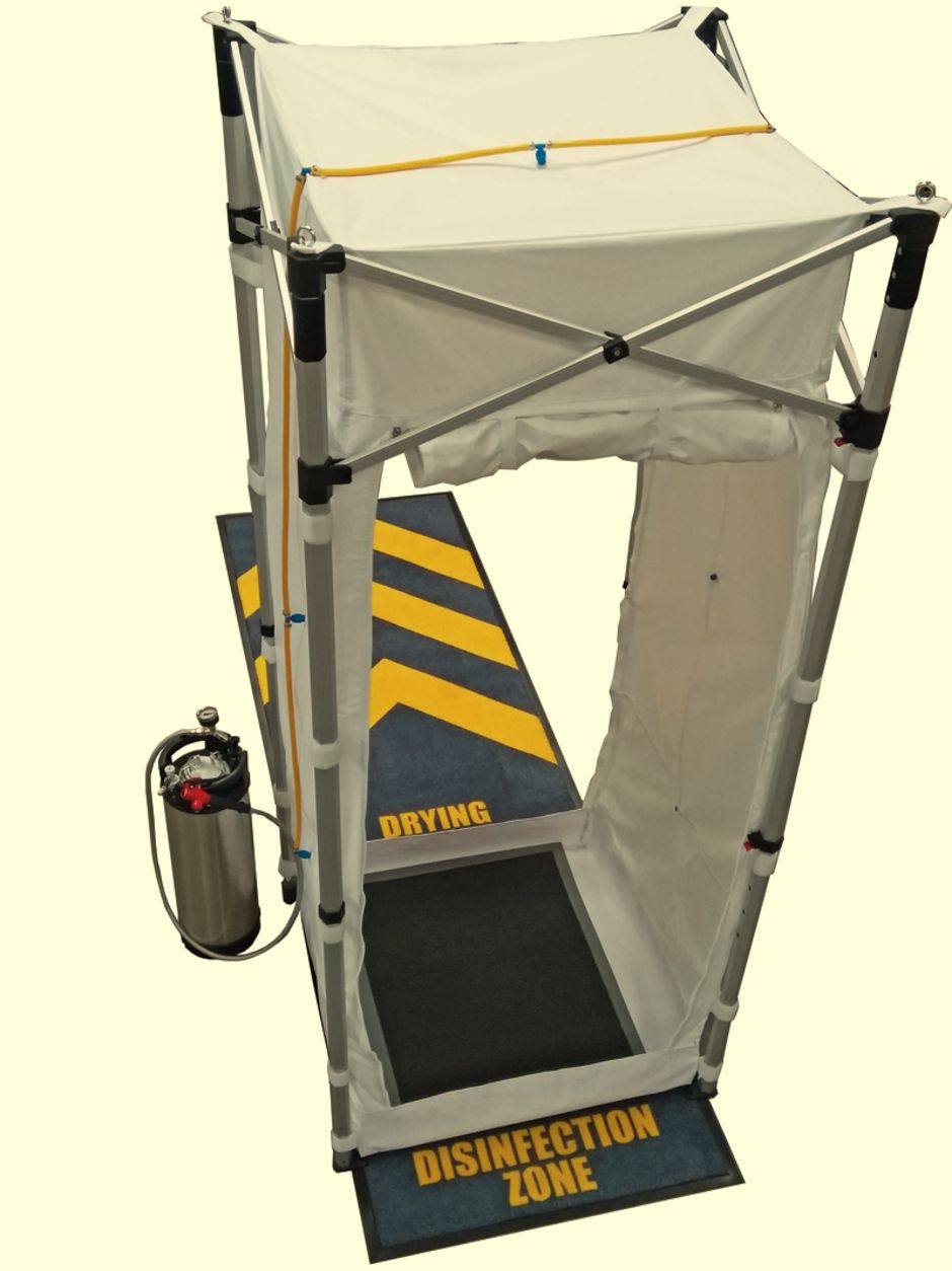 Dekontaminationsduschen mit Sprühnebeldüsen ermöglichen eine sichere Dekontamination von Haut, Kleidung und persönlicher Schutzausrüstung und töten das COVID-19-Virus zuverlässig ab, wenn sie in Verbindung mit dem entsprechenden ungiftigen Desinfektionsmittel verwendet werden. Mit einer selbst-sterilisierenden Bodenmatte ermöglicht diese tragbare Lösung eine Dekontamination von Kopf bis Fuß. Geeignet ist diese Lösung laut Hersteller zum Beispiel zur Dekontamination von PSA oder innerhalb von öffentlichen Hygieneeinrichtungen. Zudem ermöglichen Seitenabdeckungen mit Reißverschluss eine Nutzung als Durchgangsschleuse. Das Produkt ist zudem schnell bereitgestellt und mit Fußbetätigung sowie automatischer Abschaltung nach 10 Sekunden ausgestattet. Um den Transport zu erleichtern, verfügt die Dusche über eine Tasche mit Rädern. J