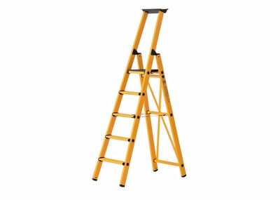 Die Plattformleiter »ProTect C 8383« ermöglicht TRBS-konformes Arbeiten und verfügt über 80 mm tiefe Stufen. Sie gewähren einen sicheren Aufstieg zu einer Plattform mit einem Maß von 500 x 424 mm, die genügend Platz bietet, um auch längere Montagearbeiten sicher durchzuführen. Die Standfläche ist zusätzlich mit einer umlaufenden Absturzsicherung umwehrt. So stehen die Beschäftigten absturzsicher auf der Plattform und haben beide Hände frei für jegliche Tätigkeiten in der Höhe. Dabei steht die Plattformleiter kipp- und standsicher dank zwei Klappauslegern am Stützteil.