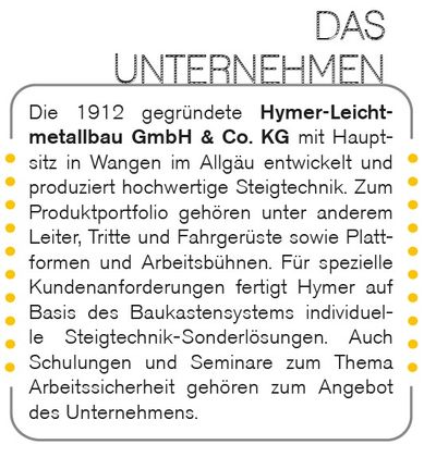 »Die Montage von Steigleitern erfordert jedoch spezielle Zertifikate und geschultes Fachpersonal«, so der Hinweis von Vertriebsleiter Christian Frei. »Deshalb stellen wir hier für unsere Kunden gerne den Kontakt zu einem professionellen Montagepartner mit geschultem Fachpersonal her, der auch über die entsprechende Manpower verfügt, ein solches Projekt termingerecht und sicher durchzuführen.« Daher arbeitet Hymer konsequent daran, sein Netzwerk an Montagepartnern stetig zu erweitern. Jüngst hinzugekommen sind etwa die Absturzsicherheitsexperten der Firma Höhenpass, die auf die Montage und den Aufbau von Steigleitern spezialisiert sind. Auch Christian Frei ist überzeugt von der Kooperation: »Wenn es hoch hinaus geht, sind unsere Kunden bei Höhenpass in den besten Händen. Wir freuen uns auf eine lange und erfolgreiche Partnerschaft.«