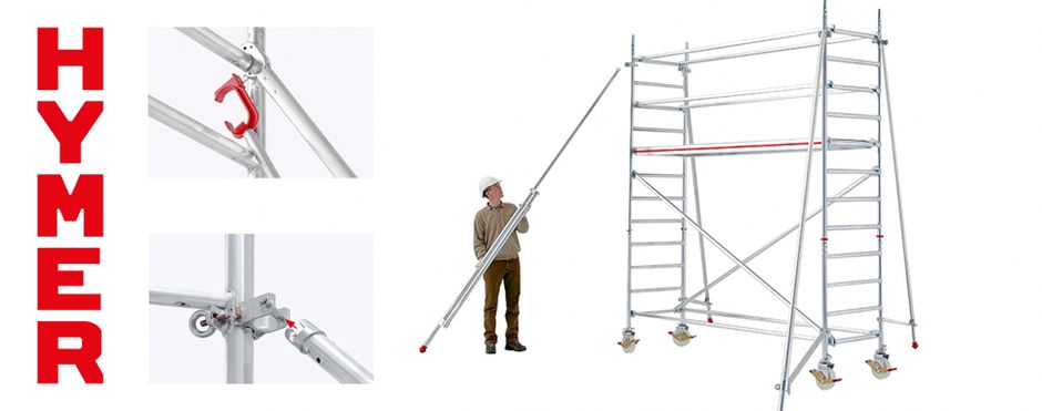 Das Sortiment von Hymer umfasst langjährig erprobte und intelligente Steigtechniklösungen mit Sicherheitsaufbau, die schon heute den Anforderungen der neuen Norm gerecht werden. »Die Sicherheit und der Komfort unserer Anwender haben bei uns seit jeher oberste Priorität, von daher sind wir bestens gerüstet und können die neue EN 1004 schon jetzt voll und ganz erfüllen«, sagt Thomas Casper. So basiert eine Vielzahl der Fahrgerüste aus dem Profisortiment auf dem sogenannten »Hymer-Comfort«-Aufbau. Diese speziell für den intensiven Dauereinsatz gefertigten, massiven Fahrgerüste sind für einen hochstabilen Stand entweder mit Fahrtraverse oder mit den von Hymer entwickelten, patentierten Bajonett-Auslegern ausgestattet. Letztere können komfortabel vom Boden aus montiert werden.