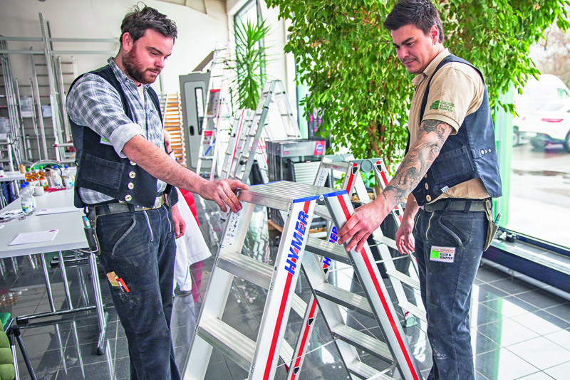 Der Leiter-Vergleichstest im Rahmen des dritten »Hymer-Expertentests« sorgte dafür, dass Profianwender die Steigtechnikprodukte einerseits ausgiebig testeten, andererseits aber auch über die Vor- und Nachteile baulicher Komponenten beim Praxiseinsatz diskutierten. Fazit der Profirunde: Es lohnt sich, Steighilfen vor dem Kauf genau zu vergleichen.