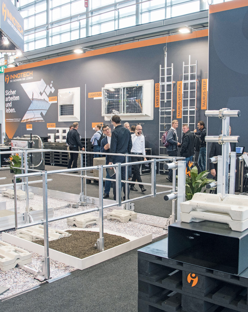 Neu war auch die auflastgehaltene Systemstütze »QUAD-30« für den Einsatz auf begrünten und bekiesten Flachdächern. Der Vorteil dieses Produkts, so Innotech, liege insbesondere in der dachdurchdringungsfreien Montage, dem Verzicht auf Eingriffe in die Bauphysik und der damit einhergehenden Vermeidung von Kältebrücken. Mit der Produktentwicklung von »Quad-30« verbinde das Unternehmen Sicherheit mit Nachhaltigkeit und biete eine optisch unauffällige Lösung für Absturzsicherungen auf umweltfreundlichen Gründächern.