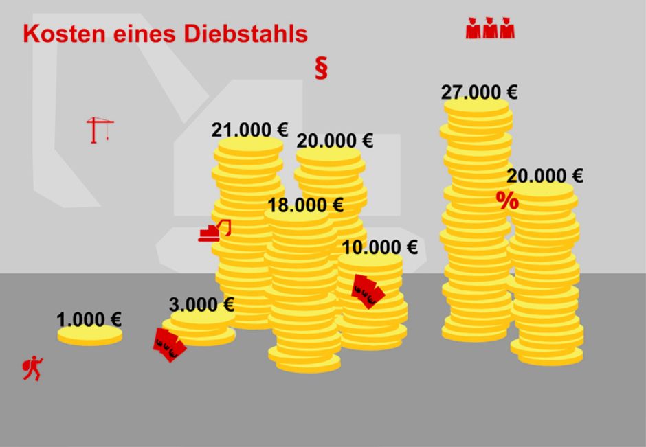 Werden zum Beispiel Spezialkabel gestohlen, ist der primäre Schaden erst einmal überschaubar. Allerdings beträgt die Lieferzeit zur Wiederbeschaffung in diesem Fall drei Wochen. Daraus resultiert ein vorübergehender Baustillstand: Die eingeplanten Gewerke können ihre Arbeit zunächst nicht weiterführen. Dadurch verzögert sich ebenso der Ausbau. Kran, andere Baufahrzeuge und -einrichtungen stehen schon bereit – müssen jetzt allerdings drei weitere Wochen gemietet werden. Weil das Gesamtprojekt nicht zum vereinbarten Zeitpunkt fertiggestellt wurde, ist zudem eine Konventionalstrafe fällig. Insgesamt führt der Kabeldiebstahl damit nach Berechnungen von ISG/Maibach Velen schnell zu Mehrkosten im Wert von über 70 000 Euro.