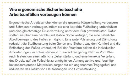 Grundsätzlich gilt jedoch: »Die Design- und Materialmöglichkeiten für Sicherheitsschuhe sind so vielfältig wie ihre Einsatzgebiete. Daher sollten bei der Herstellung und Anpassung neuer sowie bestehender Modelle immer die individuellen, ergonomischen Anforderungen der Träger im Fokus stehen. Nur so erhalten die Mitarbeiter sicheres und bequemes Schuhwerk, das Unternehmen vor fußbedingten Krankschreibungen bewahrt«, wie Hartmann und Franzisky betonen.