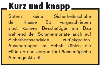 Sofern keine Sicherheitsschuhe der Klasse S3 vorgeschrieben sind, können Beschäftigte am Bau während der Sommermonate auch auf Sicherheitssandalen zurückgreifen. Aussparungen im Schaft kühlen die Füße ab und sorgen für höchstmögliche Atmungsaktivität. Die Sicherheitssandale »Jetstream Impulse Low« von Albatros soll dabei mit gutem Beispiel vorangehen, denn das Obermaterial besteht aus hochwertigem Mikrofaser, das durch abriebfeste Textileinsätze ergänzt wird. So werde es besonders atmungsaktiv sowie strapazierfähig. Die Sohlenkonstruktion mit »Impulse«-Foam bietet darüber hinaus eine optimale Dämpfung und sorgt für Stabilität und Komfort. Aufgrund der speziellen Anforderungen an Sicherheitsschuhe gibt es Sicherheitssandalen jedoch nur in den Sicherheitsklassen S1 und S1P.
