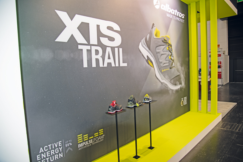 Aber auch unter der Marke »Albatros« gab es für die Fachbesucher so einiges an Neuheiten zu entdecken. Auf Grundlage der dual.Impulse-Sohle zeigte ISM unter anderem zwei weitere Modelle mit dem Namen »AER55«, die sich durch ihr nahtlos aufgebrachtes 3D-Textilgewebe in prägnanten Farbgebungen auszeichnen und dem Träger bei jedem Schritt bis zu 55 Prozent seiner Energie zurückgeben sollen. Auf diese Weise, so der Hersteller, entstehe ein besonders gutes Tragegefühl, das gerade bei der Dauernutzung auf der Baustelle erhebliche Vorzüge mit sich bringe. Außerdem ganz neu sind die »Albatros«-Sicherheitsschuhe der in Düsseldorf vorgestellten Linie »Trekstar XP«, die auf dem »XTS Cross Terrain«-Sohlenkonzept aufbauen. Die insgesamt vier neuen Modelle der Sicherheitsklasse S3 seien vor allem konzipiert für matschige und von Unebenheiten geprägte Untergründe, die häufig auch auf der Baustelle zu finden sind. Weitere Vorzüge seien hierbei die Gelenkstabilisierung, eine akzentuierte Ferse im Carbon-Look sowie sehr robuste Obermaterialen, die den Sicherheitsschuh noch langlebiger machen sollen. Ebenfalls wichtig war dem Hersteller hierbei die Verwendung eines Drehverschlusses, wodurch eine einfache, schnelle und passgenaue Schnürung erfolgen soll.