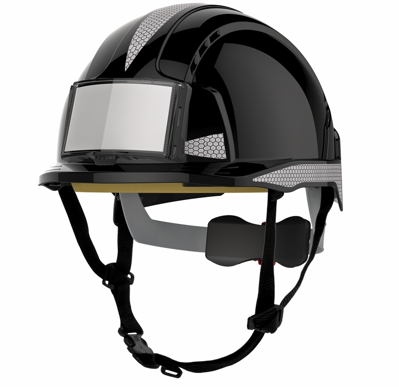 Die neuen »Evo Vista Dualswitch«-Schutzhelme hingegen sind laut JSP die ersten Helme, die den Augenschutz in Form einer Abschirmung und einer Linse integrieren und die Schutzleistung sowohl der EN397 als auch der EN12492 in einem Zertifikat bieten. Durch Betätigen des Schalters wird die Haltekraft des stufenlos verstellbaren 4-Punkt-Kinnriemens des Helmes verändert, um entweder der Norm Bauhelm EN397 oder der Norm Kletterhelm EN12492 für Arbeiten in der Höhe zu entsprechen.